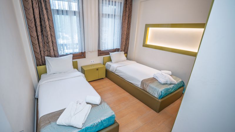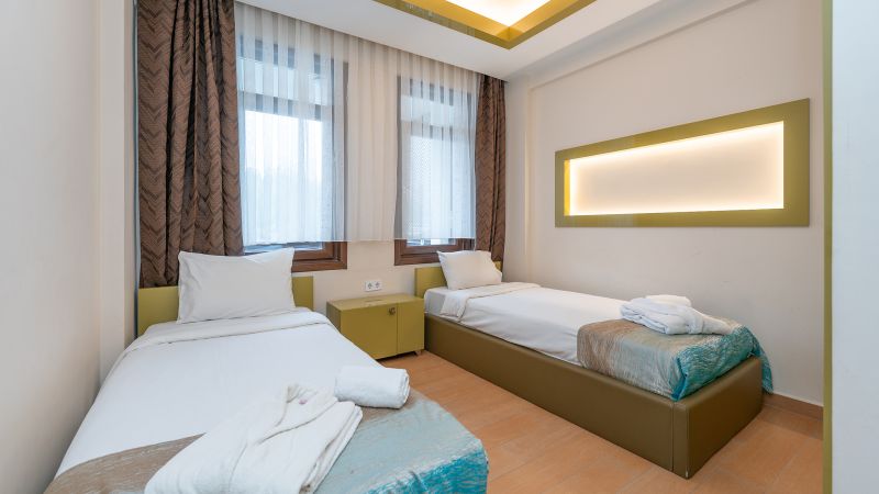 - Oda kapasitesi maksimum 3 yetişkin 1 çocuk (1 çift kişilik yatak, 2 adet çek-yat mevcuttur.)