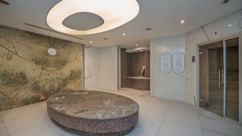 Sağlık ve dinlenme alanı olarak tasarlanmış sauna ve buhar odalarımız, misafirlerimizin stres atıp yenilenmeleri için ideal bir ortam sunar. Klasik sauna, bio sauna, buhar odası, macera odaları, şok duşları ve özel dinlenme alanları gibi pek çok seçeneğimiz, modern tasarım ve yenilikçi özelliklerle birleştirilmiştir.